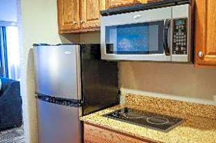 Featuring a kitchenette with a microwave, refrigerator and a sink, this room includes a work desk with an ergonomic chair and a coffee maker.