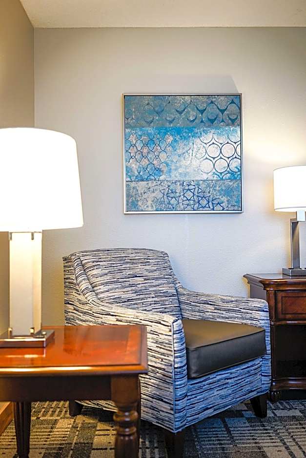 This spacious suite offers a separate seating area with a sofa, along with a work desk and ergonomic chair.